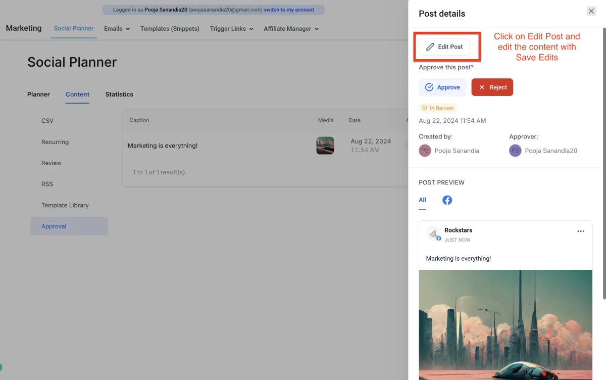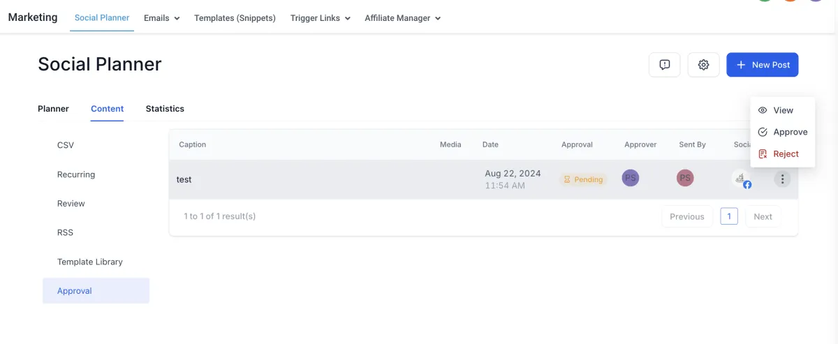 4. The reviewer can see the post in Content > Approval tab with the option to view, approve or reject. The view option will allow user to view the details of post than approve or reject. The reviewer team member can view option and it has option to edit the content too for approval flow by clicking "Edit" in view screen.